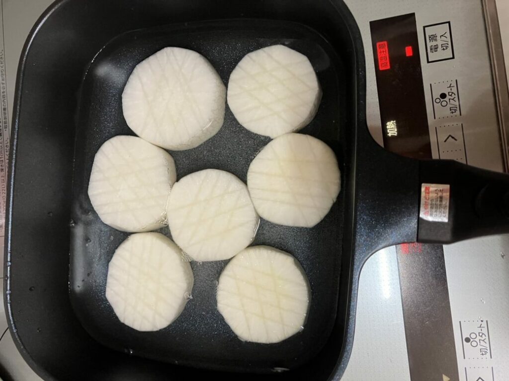 • 大根を1.5~2cm幅で輪切りにして皮をむき20分ほど下ゆでする