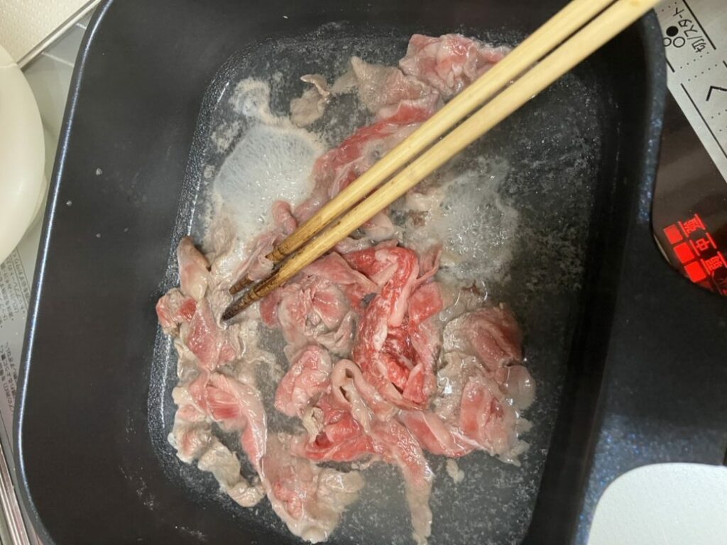 • フライパンに水を沸騰させ牛肉をさっとしゃぶしゃぶさせる
