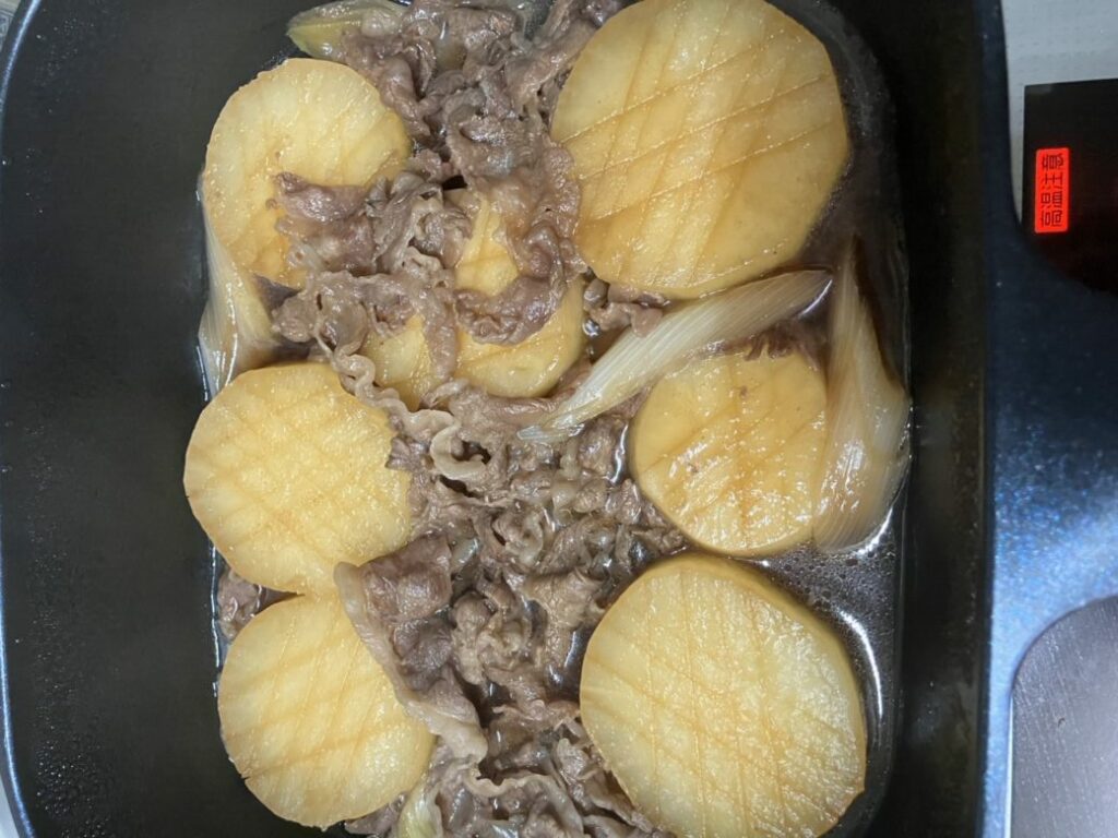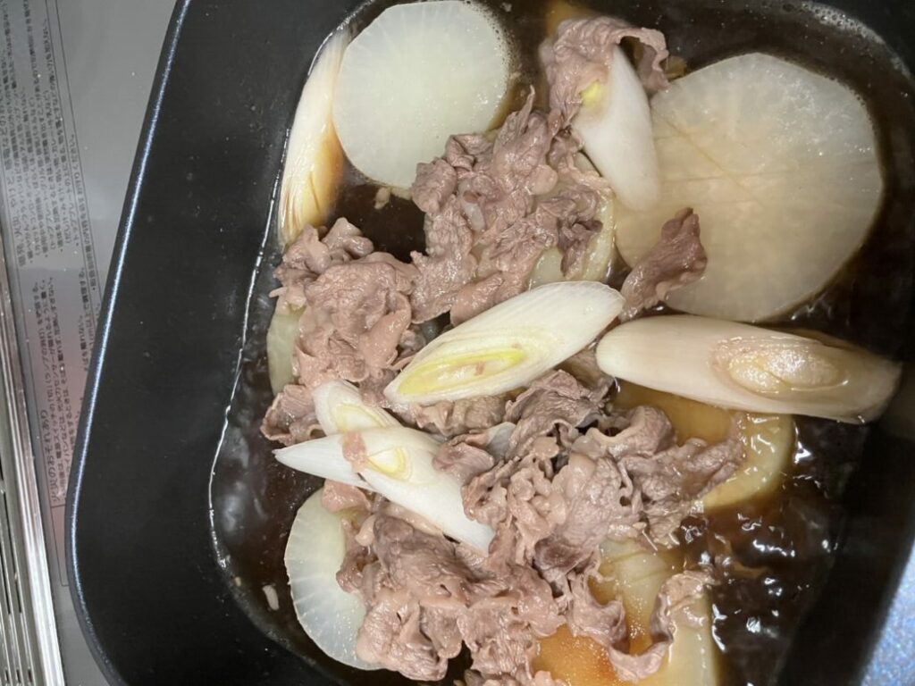 • 大根を入れて肉を大根の上に乗せるように置き調味料を全部いれる